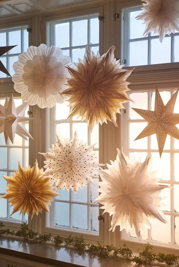 Папір є одним із найдоступніших та найбільш універсальних матеріалів для швидкого створення святкового декору. За допомогою паперу можна втілити як прості, так і складні, витончені ідеї, не вимагаючи значних фінансових витрат. Для роботи підійде як звичайний офісний папір, так і більш щільний картон, дизайнерський папір або старі сторінки книг. Паперові іграшки, виконані у техніці орігамі або кірігамі, додають ялинці відчуття легкості та невагомості.